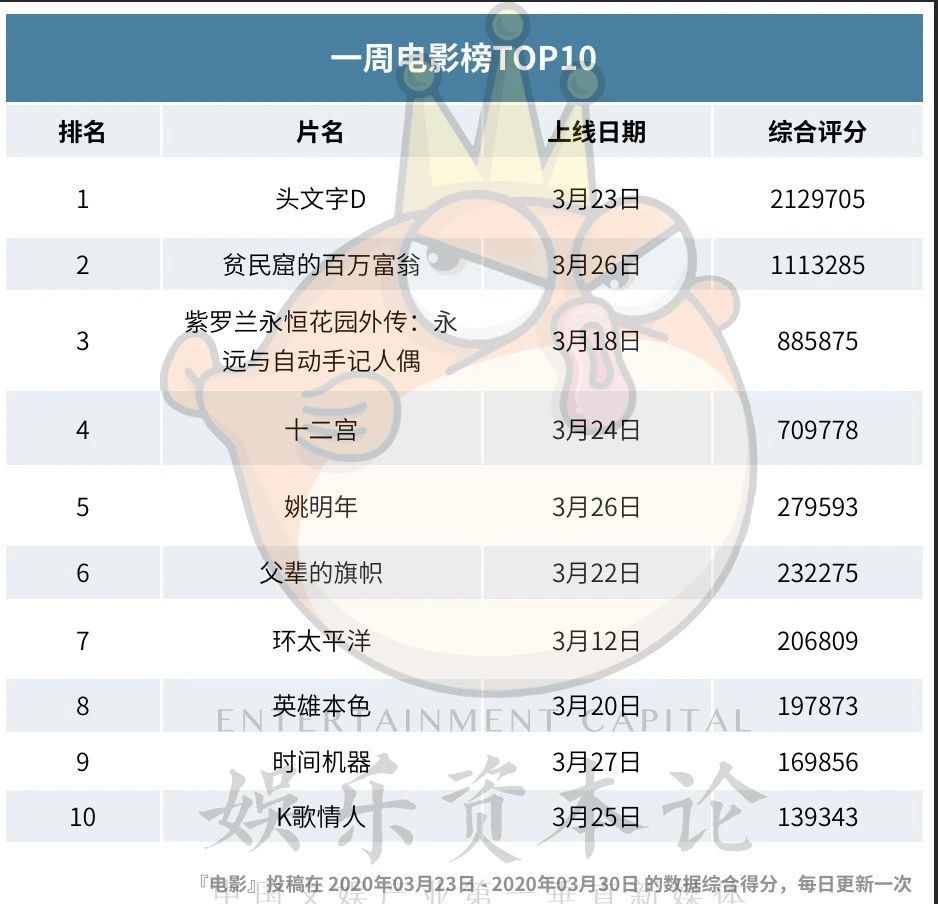 河豚影视档案(id:htysda)以3月23日-3月30日的影片为例,在这一周的时间内上线了20部影片,平均一天上线2-4部。这些影片中,《头文字D》、《贫民窟的百万富翁》、《十二宫》、《姚明年》、《父辈的旗帜》都登陆了当周的综合评分榜前十。实际上,榜单上其他影片,也都是近期刚上线的。
